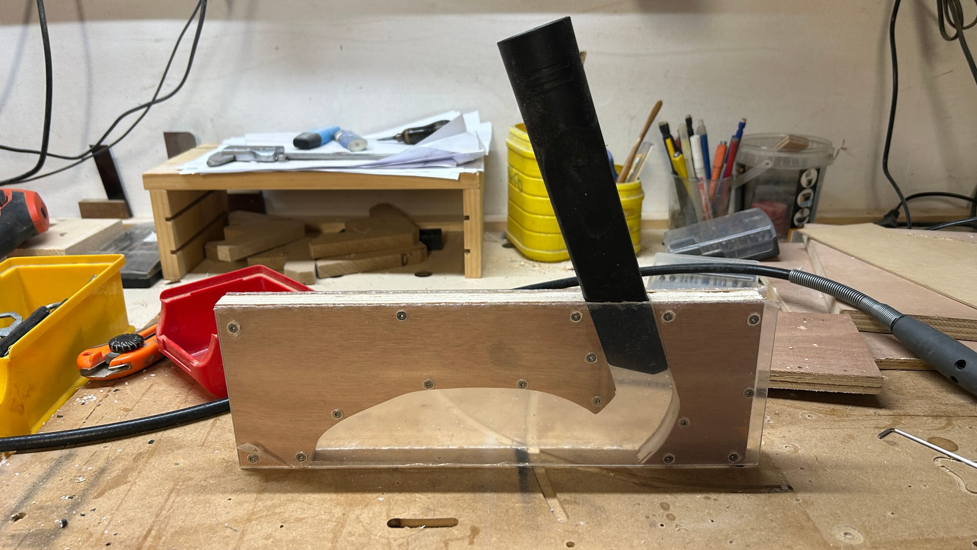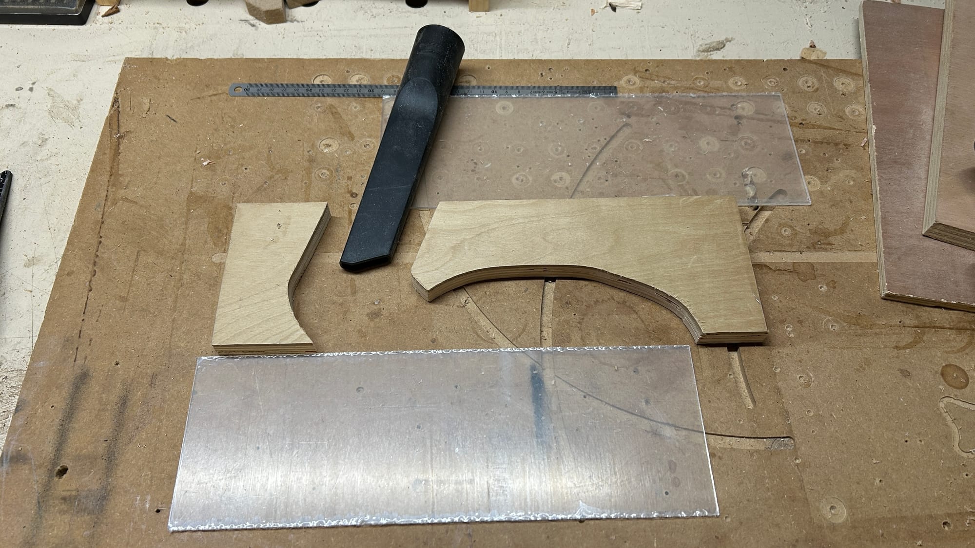Pour la cape, un peu de contre-plaqué, et des plaques de polycarbonate pour les joues.