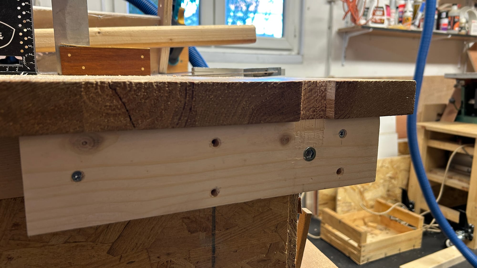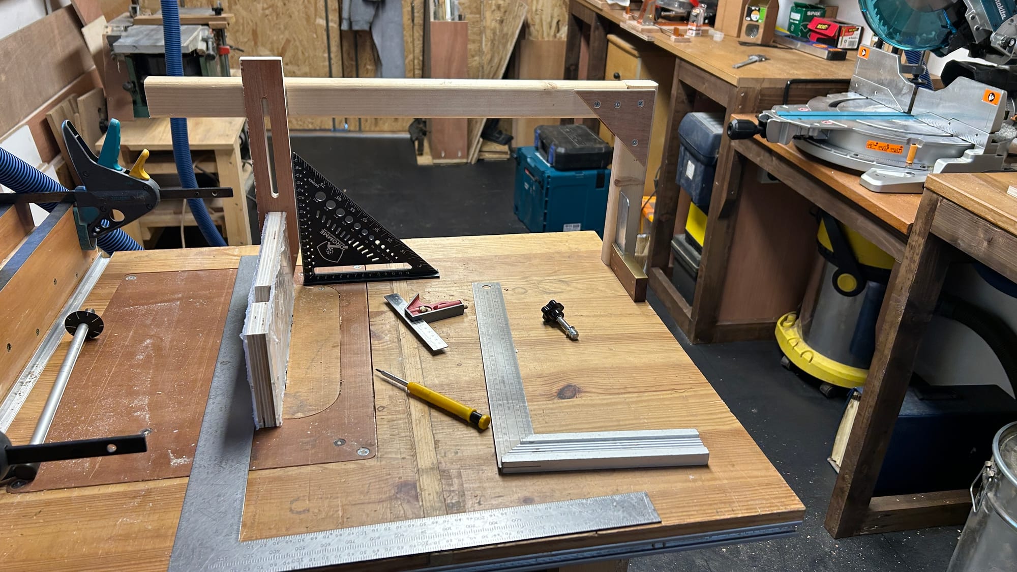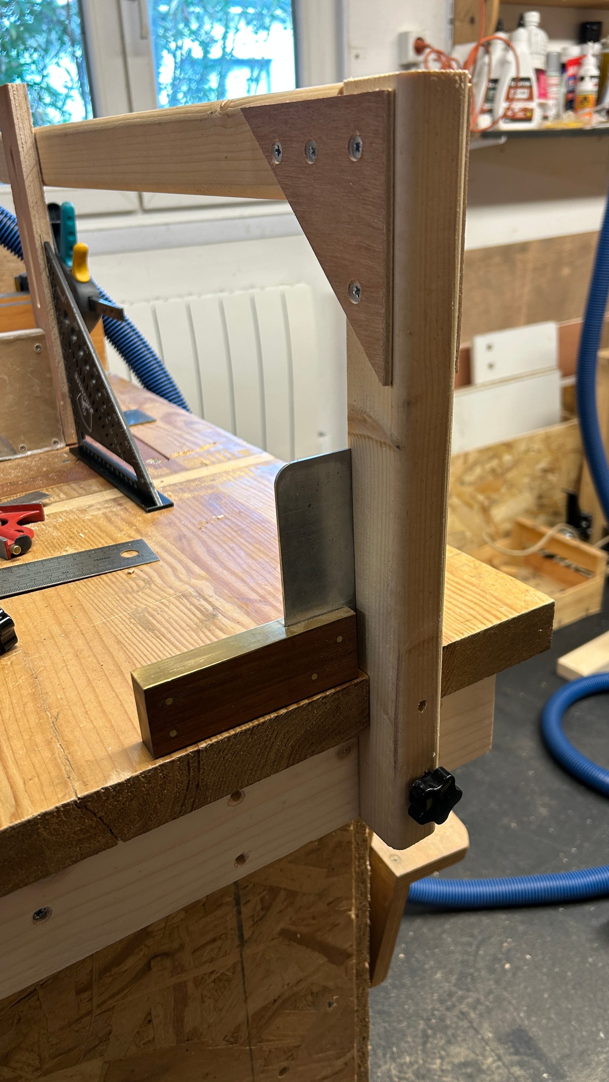 D'une part, il faut un support, et celui-ci risque de venir gêner le déplacement du rail de guidage ou des grandes pièces. J'ai décidé de faire une potence, fixée sur le côté du combiné, et facilement démontable.