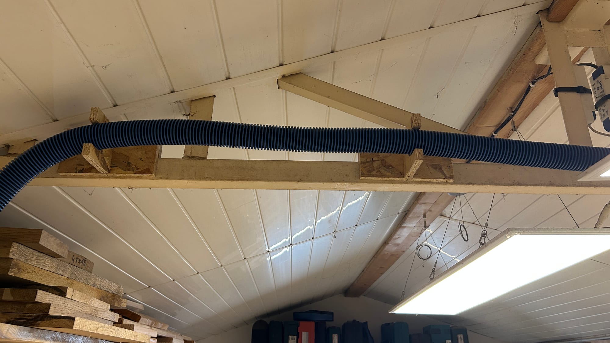 Au passage, j'ai aussi installé le tuyau d'aspiration en hauteur, dans un premier temps de manière très artisanale avec quelques ficelles, et puis après quelques semaines d'utilisation, j'ai fait des supports, sûrement une première version à laquelle j'apporterais quelques modifications dans le futur.