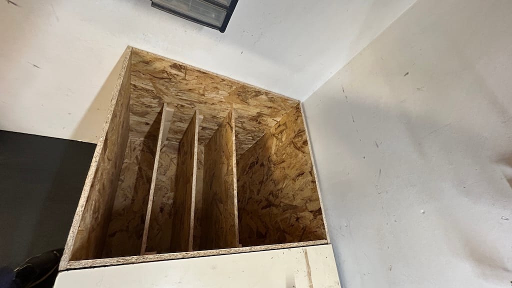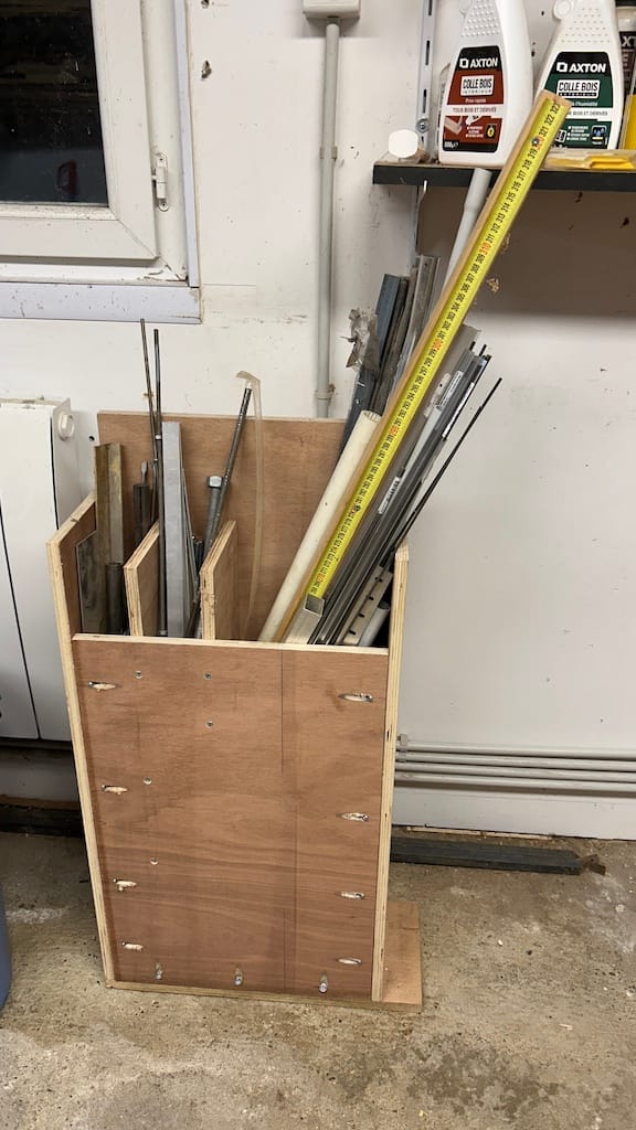 Le second rangement est pour les panneaux. Je l'ai positionné dans le prolongement de la porte, pour optimiser l'espace au mieux. Là encore, le coup de main de Papa était le bienvenu. Cela a été relativement long à faire.