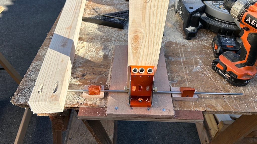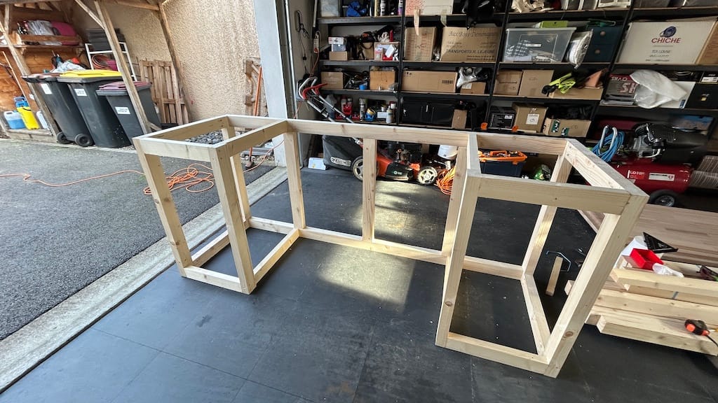 Les plans des éclatés et fiches de débits m'ont bien aidé pour préparer toutes les pièces; cela m'a fait gagner pas mal de temps je pense. Le piètement est assemblé principalement par pocket holes, à l'aide d'un nouveau guide acheté sur Vevor. Plutôt pas mal pour le prix et mon usage, qui restera très occasionnel.