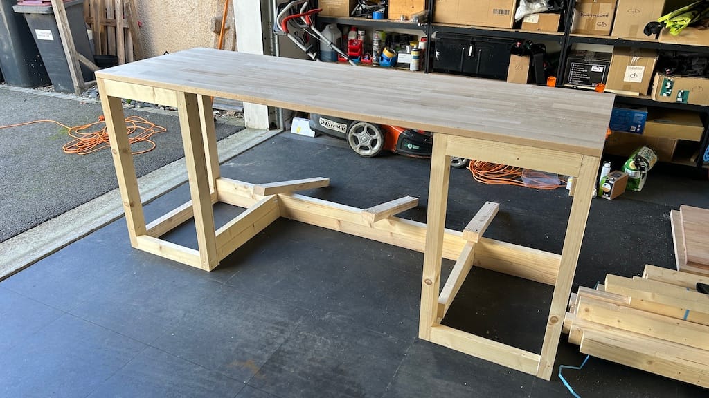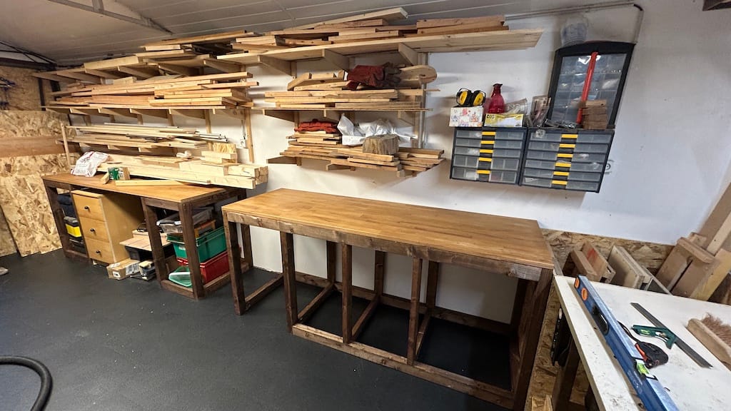 Les établis sont réalisés avec des tasseaux de 70x44 et 70x34. Les plateaux sont des plateaux de hêtre, 200 x 65, 26 mm d'épaisseur. Ces meubles vont me servir principalement à ranger, dans des tiroirs à réaliser, et à avoir un espace pour poser le matériel, outils pendant la réalisation des projets. Ils vont aussi servir de support pour la scie radiale, j'aimerais avoir des guides de part et d'autre de la scie, et qu'ils servent de surface d'appui pour les longues pièces.