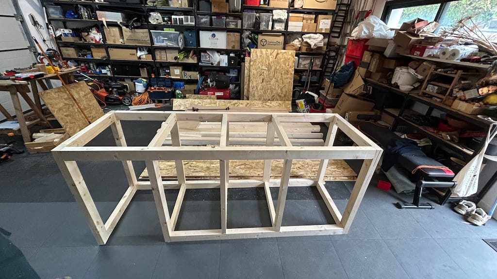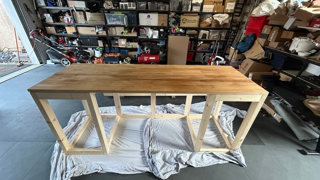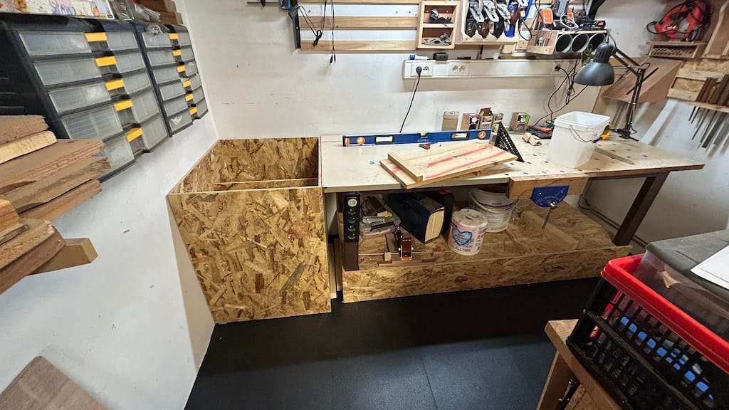 Le second établi va accueillir le collecteur de copeaux sur la gauche, 2 blocs tiroirs au centre, et les poubelles sur la droite.