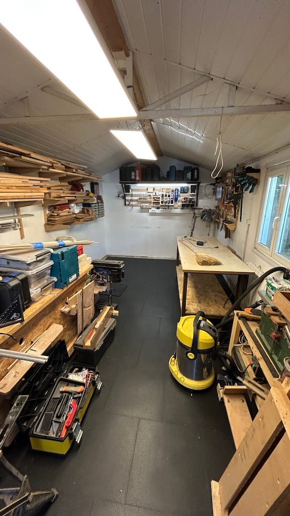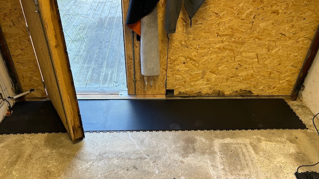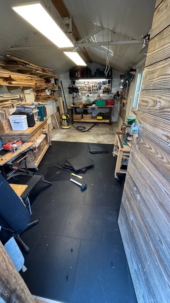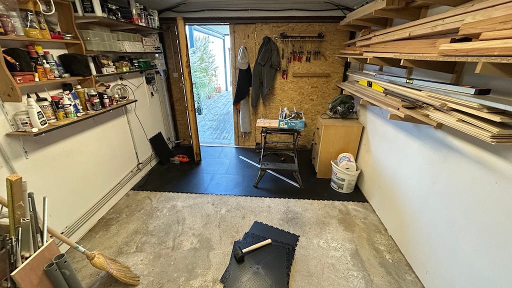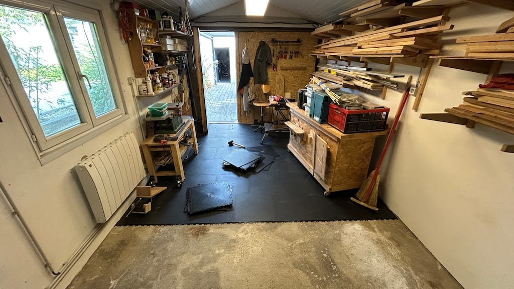 Pour le sol, je pose des dalles comme dans le garage : ça se pose sans colle, jusque quelques découpes à la scie sauteuse, on emboite au maillet. En une matinée, c'était plié.