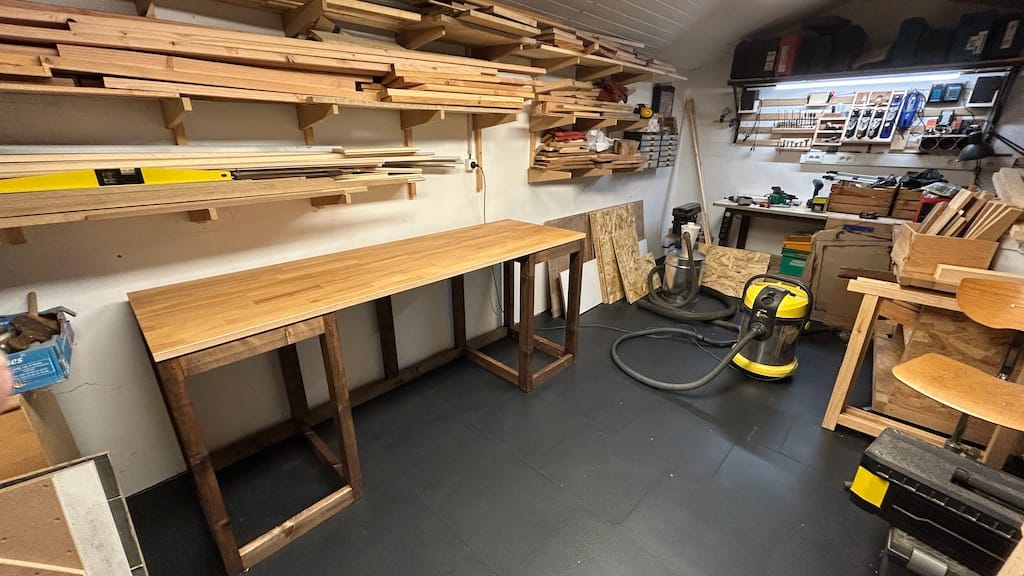 Il manque encore le plateau entre les 2 établis (sûrement à écarter un peu) pour accueillir la scie radiale. L'aspirateur ira dessous.