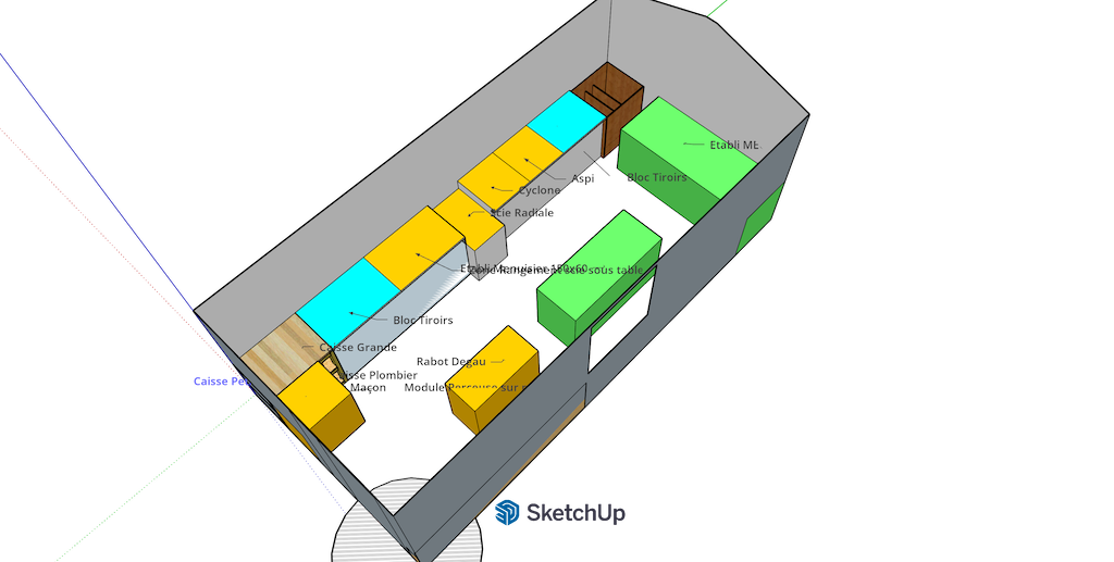 Une fois les meubles ou rangements dessinés, je les ai remis leur place. Si j'arrive à réaliser cela, ça va être chouette. On voit qu'il va y avoir quelques tiroirs à fabriquer, de longues journées en perspective.