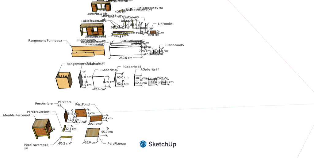 Ces plans m'ont surtout permis d'identifier les différentes pièces, ou éléments de bois à découper, et d'en déduire à la fois les fiches de débits, et liste des matériaux à acheter/commander.
