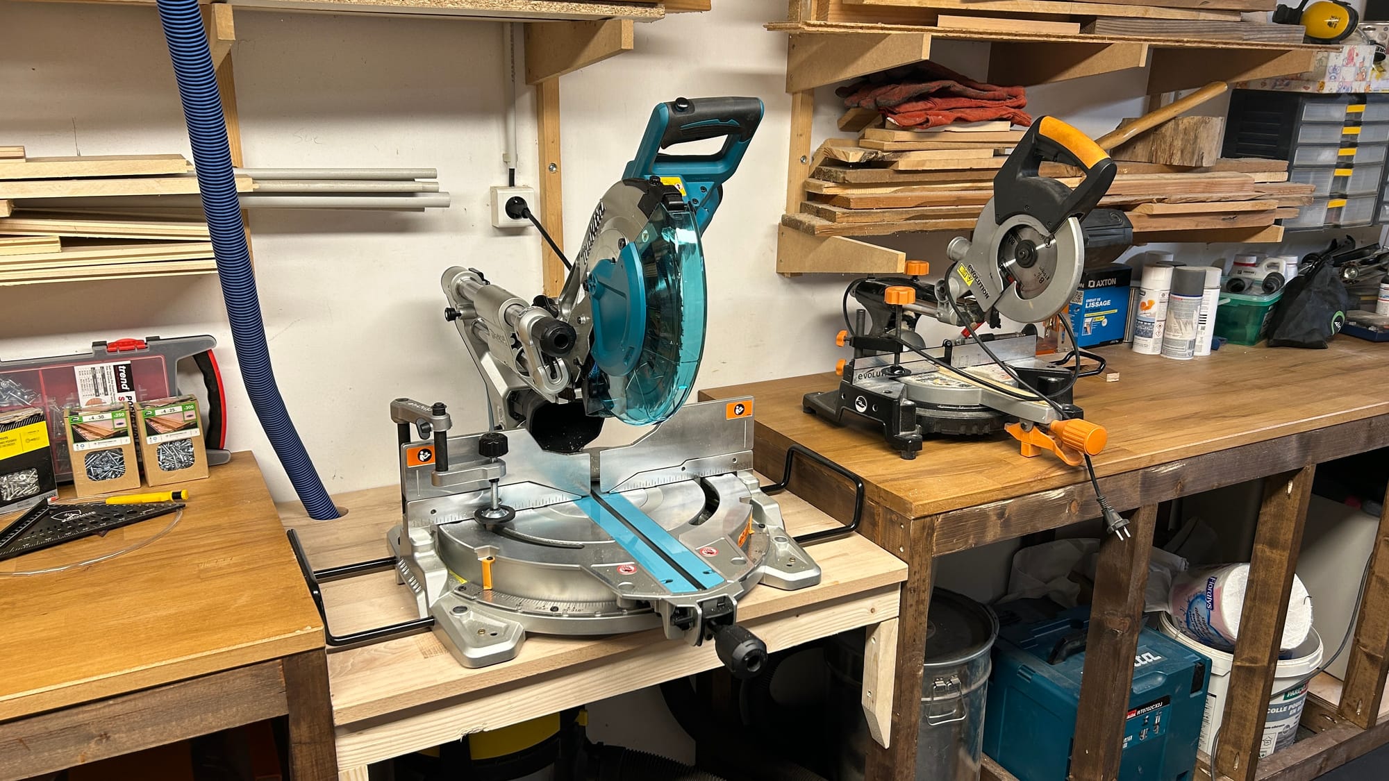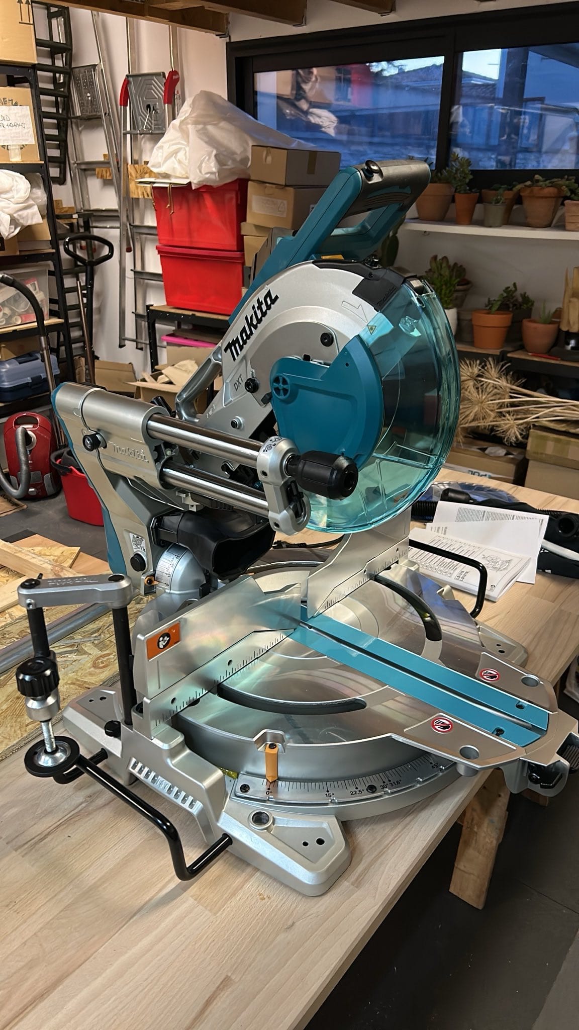 Mon choix s'est porté sur une Makita, avec une lame en 260 et surtout un système de guidage différent de l'Evolution, qui permet de mettre la scie au plus proche du mur, sans avoir à garder de la place derrière. La Makita est aussi beaucoup plus lourde (autour des 45kg), ce qui la rend de fait très peu mobile. Dans mon cas, ce n'est pas très grave. J'ai vu avec la précédente que j'étais très rarement amené à l'utiliser ailleurs que dans l'atelier.
