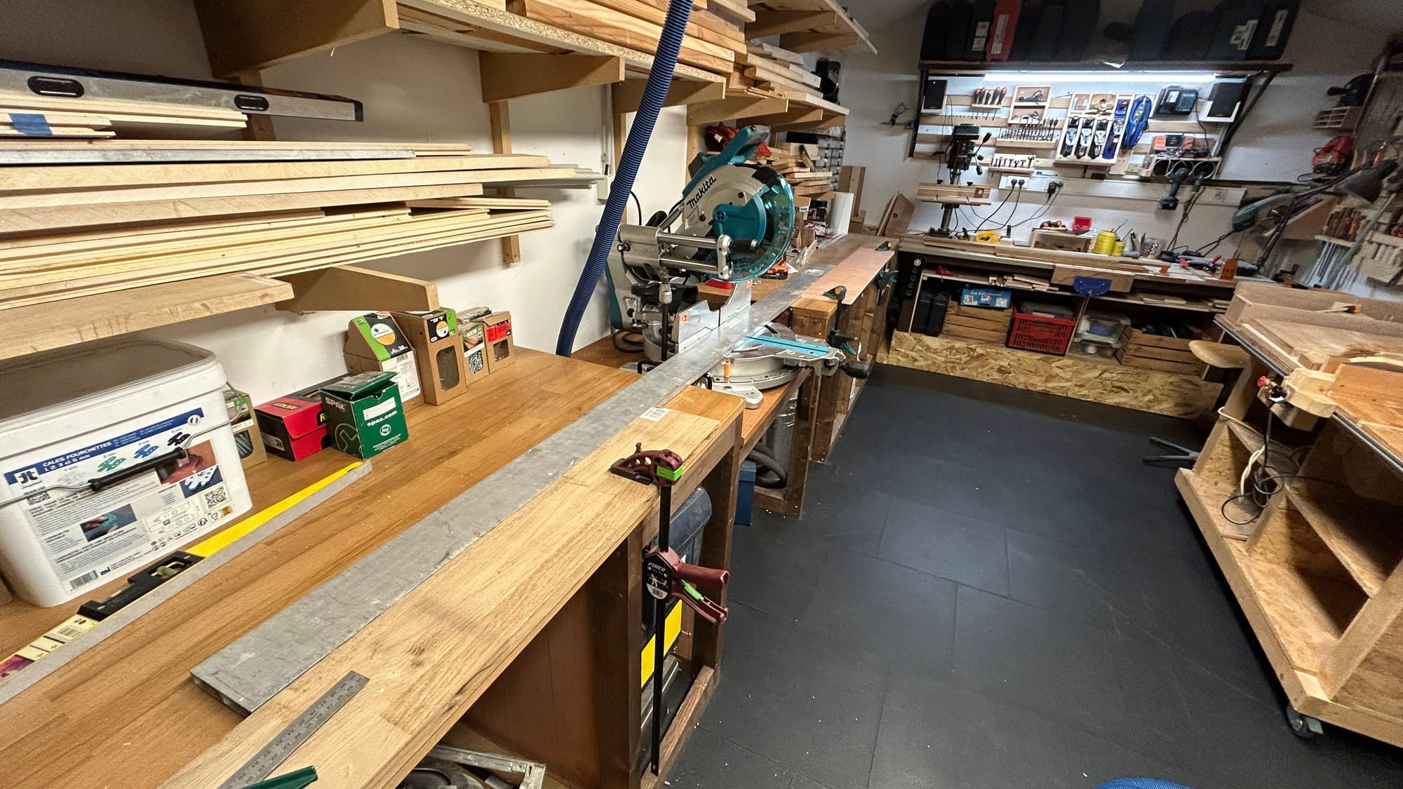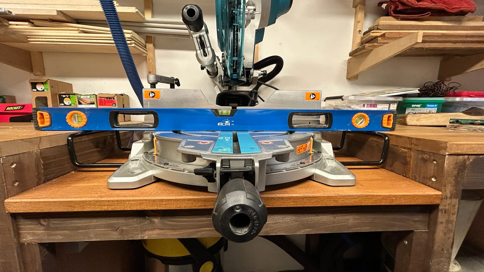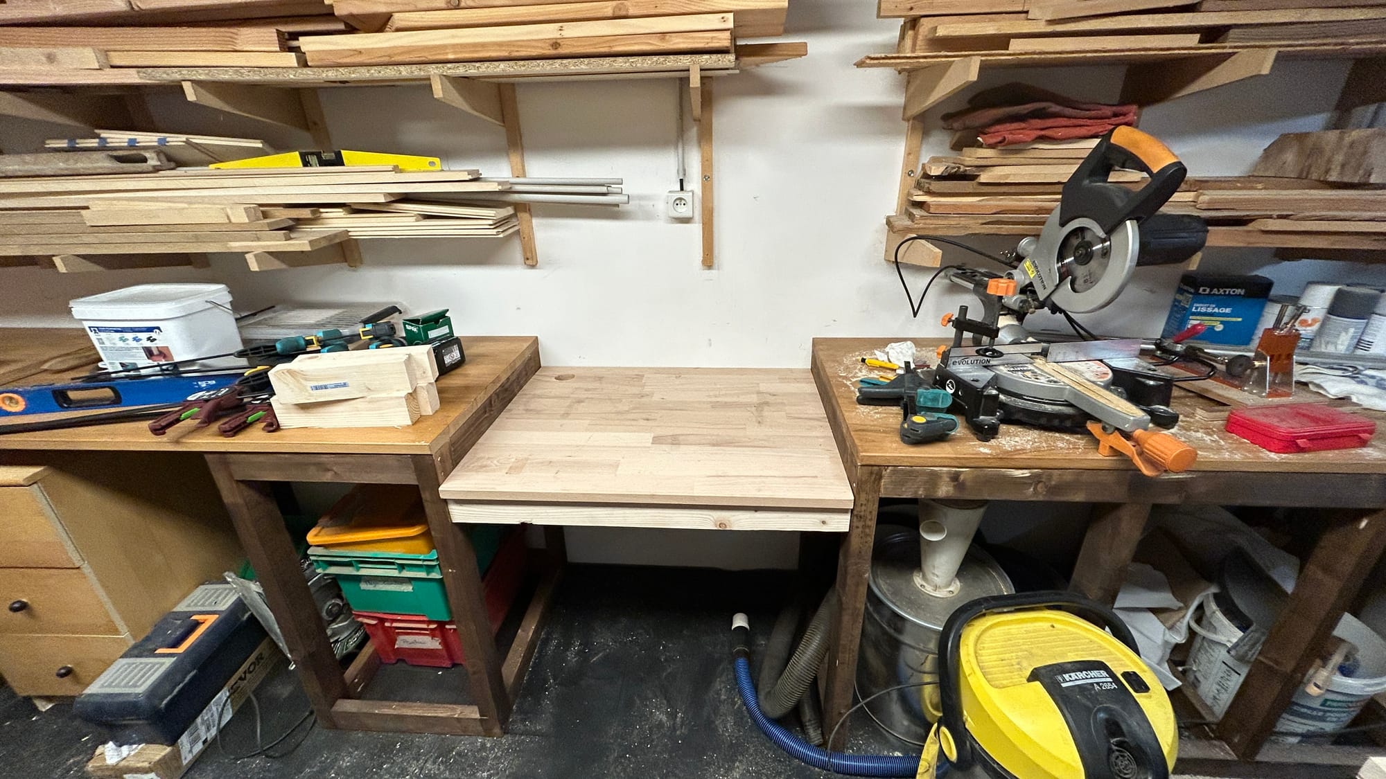 La principale difficulté dans cette installation a été de mettre le plan de travail accueillant la scie à la bonne hauteur, et de niveau. En effet, je voulais que les 2 établis soient à la même hauteur que la table de la scie elle-même de manière à ce que les pièces à couper soient parfaitement soutenues au delà de la table de scie.