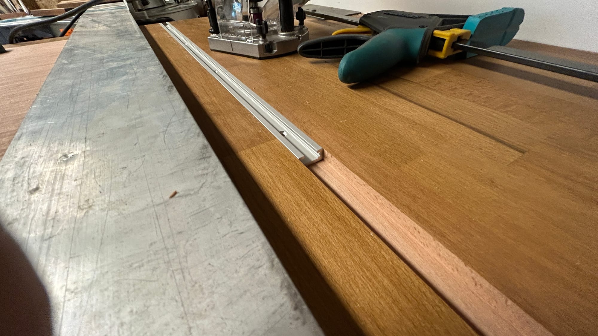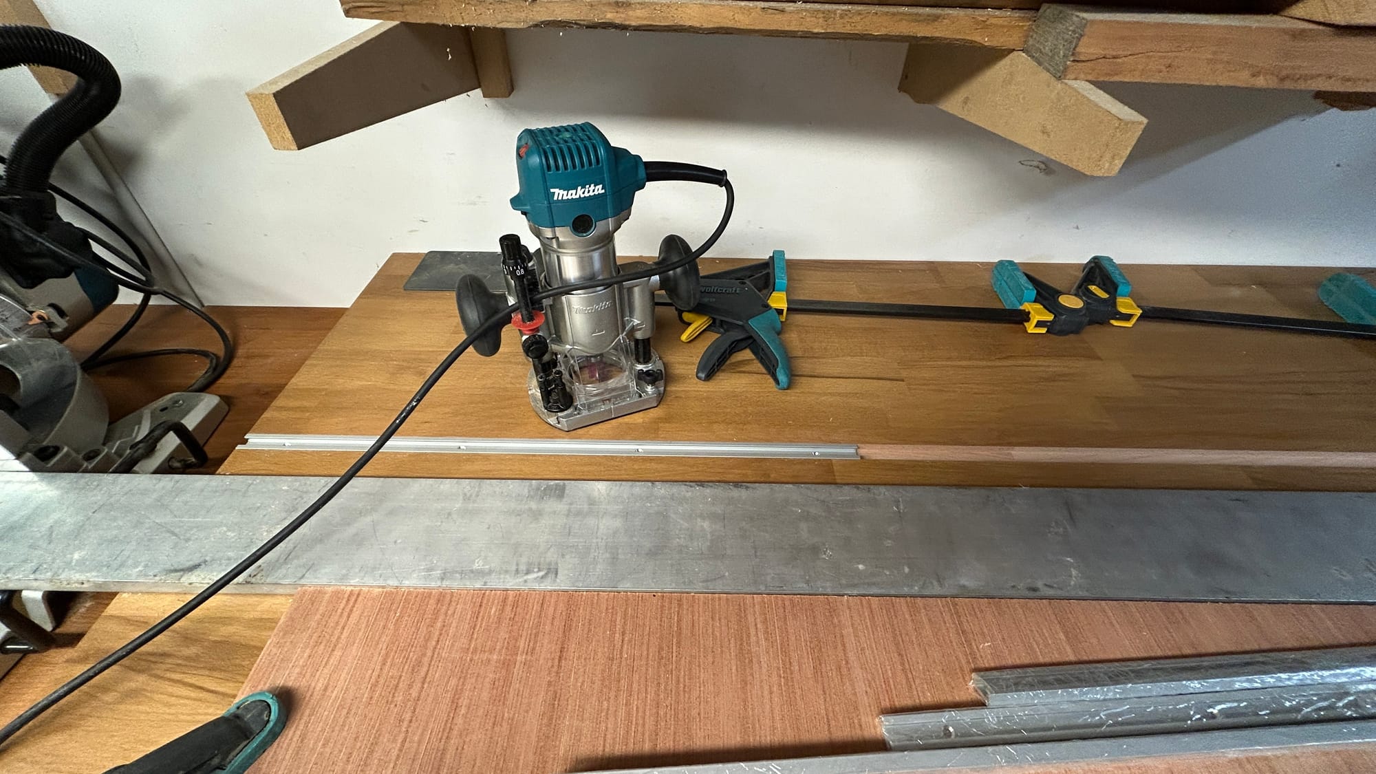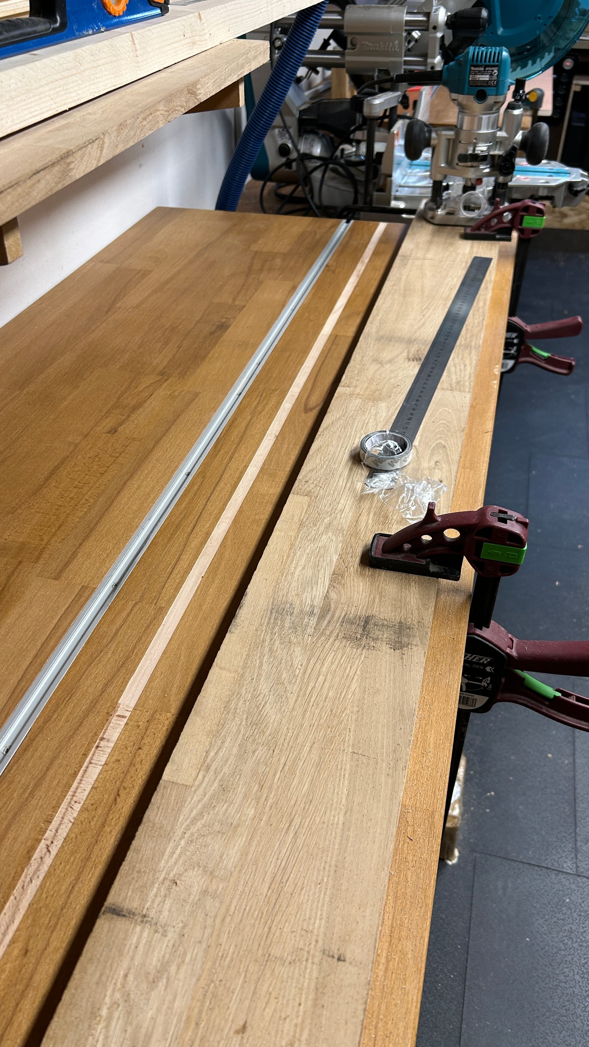 Une fois la scie installée, j'ai ensuite usiné les établis pour installer des rails à rainure en T.